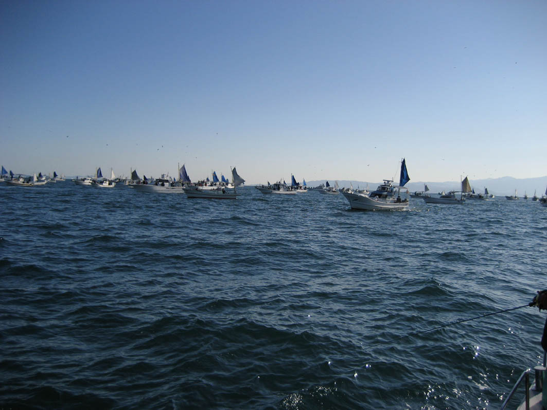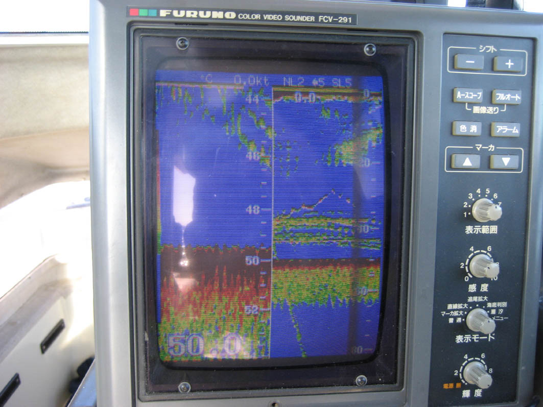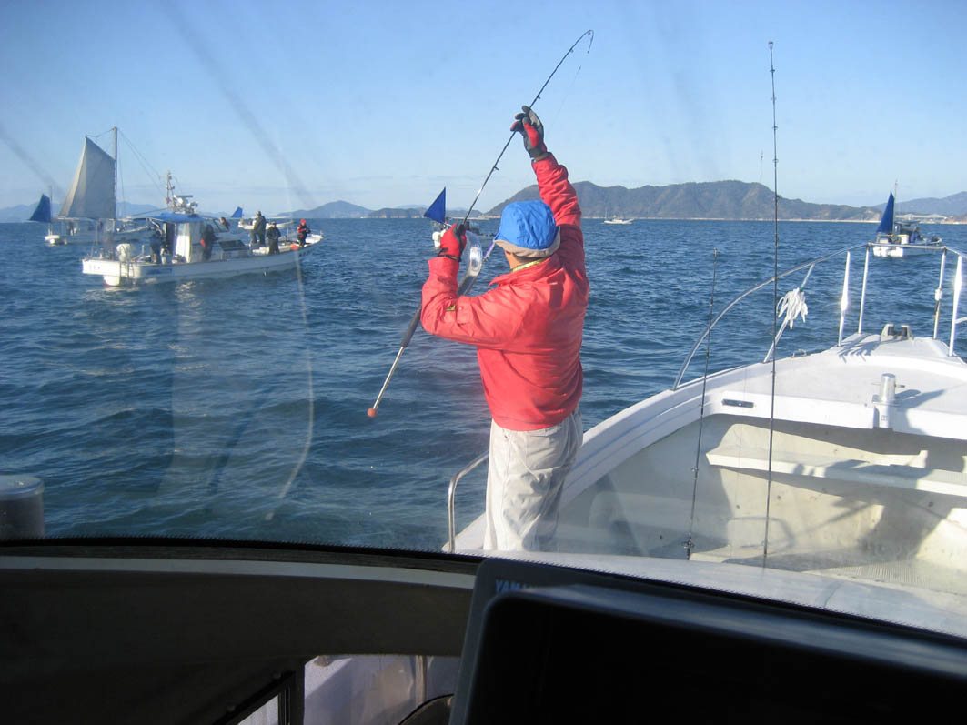 期待と不安を胸にアホな話で盛り上がりながら約1時間。鹿島を過ぎたところで魚探に反応が・・・周囲には引き釣りの漁師さんの船が数隻います。さっそく操船をかわりスパンカーを張り探索するも微妙な反応。舘場方向には2箇所船団がみえます。私の心の弱さか、日本人特有の集団心理か・・・やっぱり大きな船団に行くことにしました。