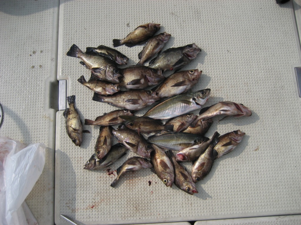 湧き潮で船の流れが安定しない中、釣れるか根掛りかという状態でしたので私は操船に専念。30cm近いものから20cmがコンスタントに釣れます。チダイの30cmくらいを3枚と平郡サイズのアジもOK野君が釣りました。