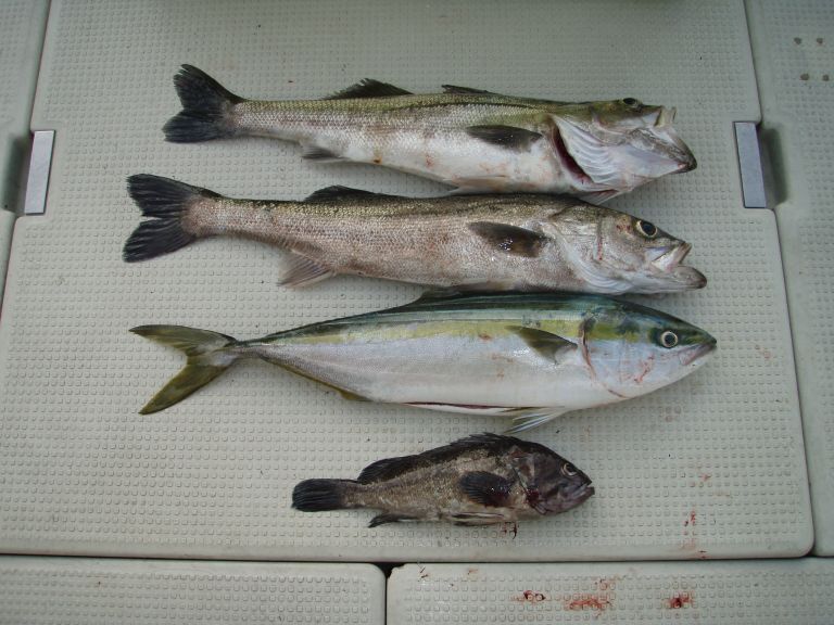 潮が変わってからは我慢の時間が長くありましたが私が連続2本良い型のスズキを釣り、終了前にYONEさんがワカナ1本。