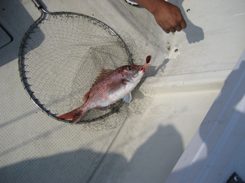 あまりにも釣れないので、私は土佐カブラをおもりをつけて投げるとすぐに釣れますが良型1に対して金魚サイズ5。(でも土佐カブラは最強)
