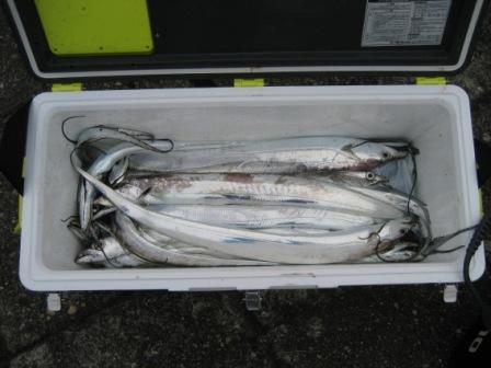 前半は、東よりの風で満ち潮なのに放っておくと逆方向に1ノットくらいで流される釣れにくい状況。後半は風が落ち波も落ち着きましたが、肝心のタチウオの食いは上向かず・・・