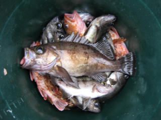メバルのデカイヤツです。バケツの底いっぱいです。今後は30cmオーバーもつれるでしょう。